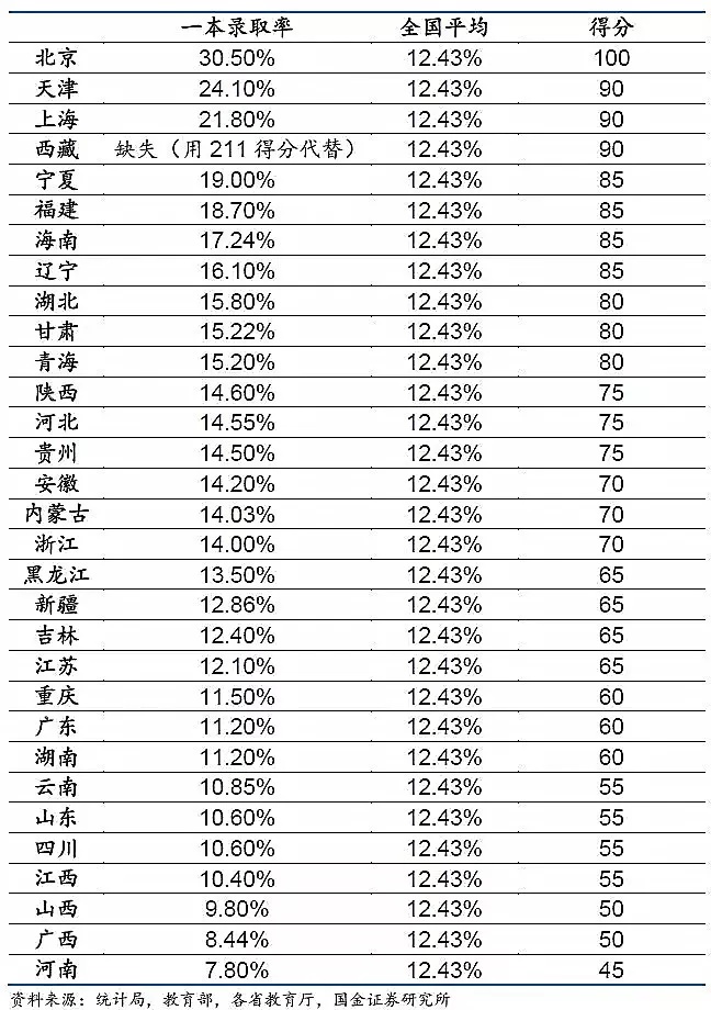 一本录取率:指该省所有高考考生中,被一本高校录取的人数比例。全国平均大约是12.43%。